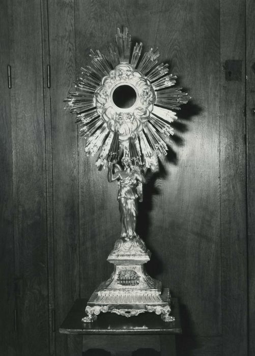 Ostensoir en argent doré et vermeil. Pied doré de forme rectangulaire avec quatre pattes d'animaux à griffes. Double moulure en scotie, l'une cannelée, la plus importante avec médaillon (agneau pascal sur le devant, triangle trinitaire à l'arrière). Noeud rectangulaire à la base, hémisphérique à la moitié supérieure et supportant un ange ailé, en argent, vêtu d'une tunique plissée. Partie supérieure en forme de soleil supporté par la tête de l'ange. Custode centrale nimbée d'un nuage d'argent avec têtes d'angelots à l'avant d'où partent des rayons dorés.