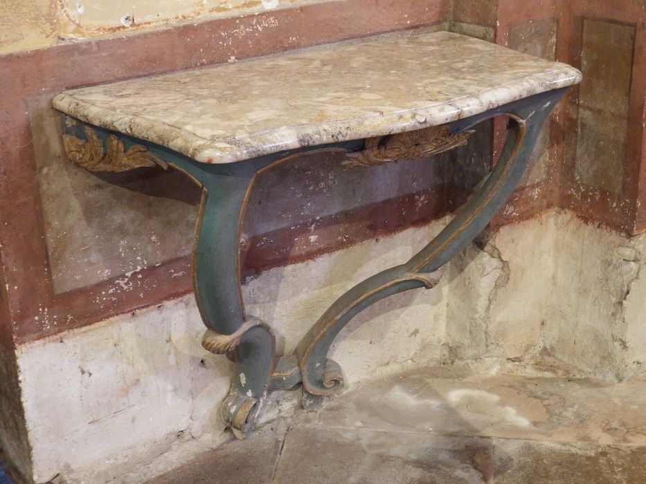 Les 2 consoles, placées sous les petites peintures sur pierre se composent, chacune de 2 pieds formés, chacun, de 2 C alternés. L'entablement sur lequel repose le marbre est orné de feuillages, sur chacune des faces latérales, et d'une coquille entourée de feuillqges sur la face antérieure.