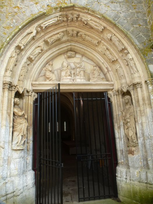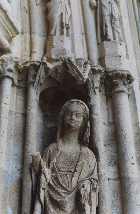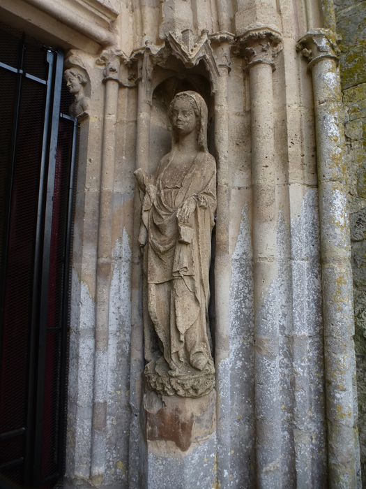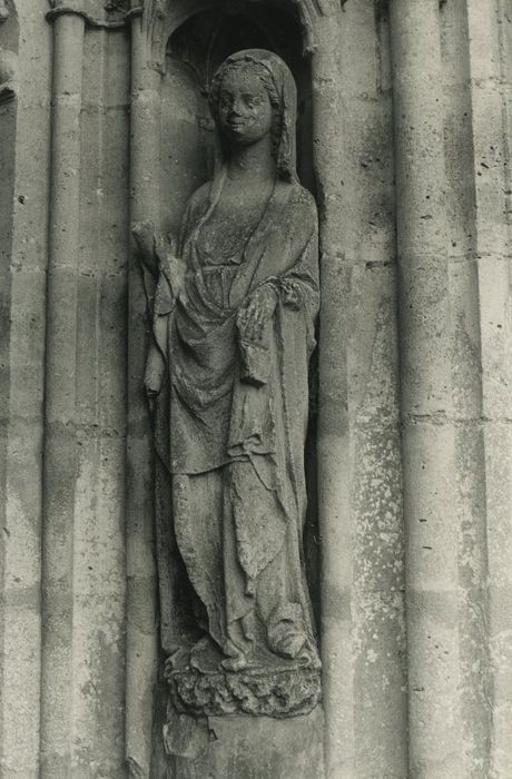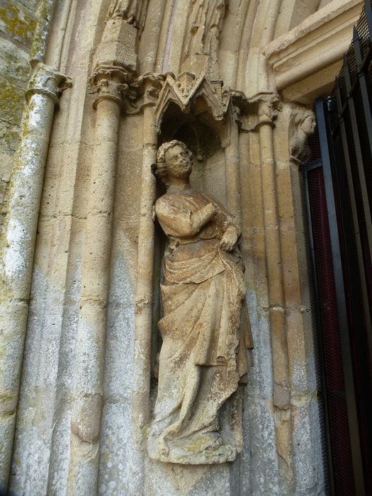 Groupe de deux statues. Dans les pieds-droits du grand portail, statue de la Vierge à droite et de l'Ange Gabriel à gauche.