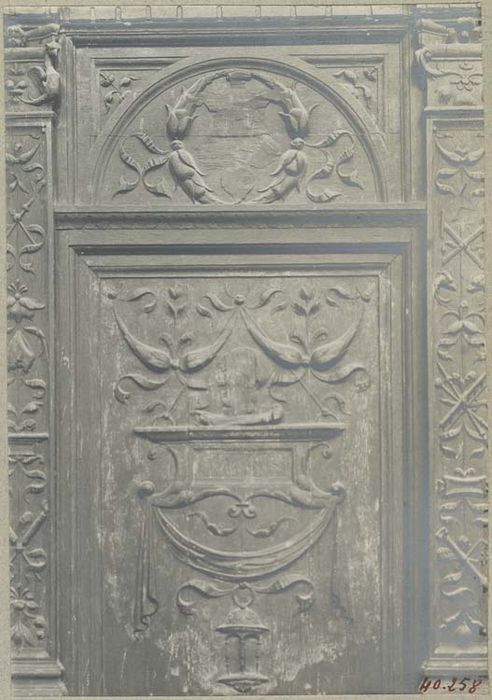 Banc à haut dossier formé de panneaux sculptés et décorés d'arabesques, encadrés de pilastres ornés sur les chapiteaux desquels repose la corniche. La face antérieure du banc est pleine et les panneaux sont également ornés. Enfin, en avant du banc, la crédence est décorée de panneaux richement sculptés.
