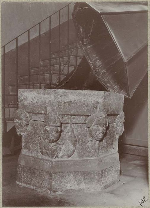 Cuve octogonale sur un socle mouluré ; ornée aux angles de figures et têtes d'animaux de facture grossière.