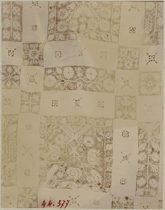 Composée de carrés de grandeurs diverses de guipûre de Venise et de toile brodée à points coupés. Un des côtés est orné en bordure d'une dentelle à motifs galonnés (travail ancien), en 4 morceaux réunis par des coutures (style du 16e siècle).