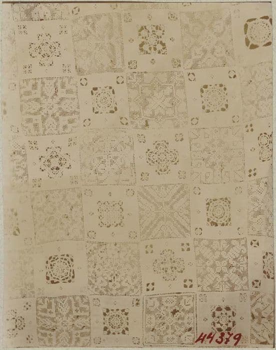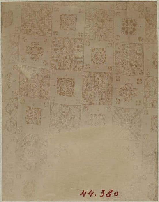 Composée de carrés d'égale grandeur alternés, tantôt de gripure Venise, tantôt de toile brodée au point coupé (style XVIe siècle).