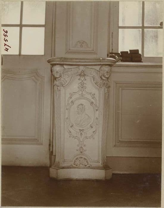 Boiseries, aux deux extrémités de la pièce, entre les deux fenêtres, consoles pleines, sculptées.