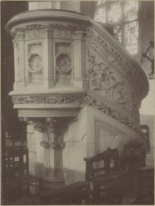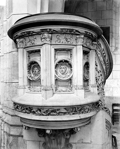 Cuve cylindrique décorée de pilastres supportant une frise ornée de monogrammes, et encadrant des panneaux à médaillons sculptés. Le rampant de l'escalier tournant est plein et décoré de rinceaux. L'abat voix est moderne.
