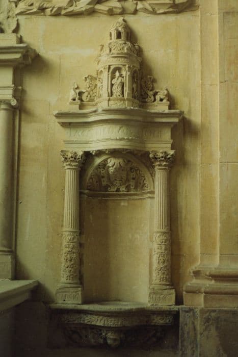 Fond demi-circulaire, à cul-de-four. Entablement supporté par deux colonnettes cannelées et ornées de bas-reliefs, aux chapiteaux corinthiens. Au-dessus de l'entablement petit édicule à trois étages orné de cinq niches contenant de petites statues, daté à la base d'une colonette 1556.