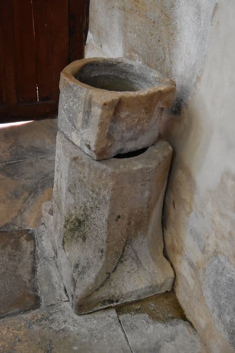 mesure à grains, actuellement bénitier, posé sur un chapiteau