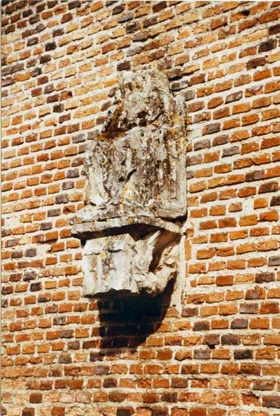 Statue extérieure acéphale (Enfant et tête de la Vierge disparus depuis au mons 1848) de la Vierge assise dans un fauteuil. La statue repose sur un socle formé d'une église soutenue par deux anges plaqués latéralement et horizontalement : c'est la maison de Lorette (rareté du thème iconographique).
