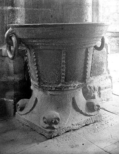 Deux bénitiers et les chapiteaux qui leur servent de socles. Bénitiers en forme de tronc de cône renversé, ornés à la base d'une légère saillie où viennent s'arreter 8 petits contreforts denticulés. La partie supérieure se compose de 3 fortes moulures surmontées d'une boule qui accentuent la forme évasée des bénitiers. 2 anses arrondies et bien saillantes, prenant sur les 3 moulures et sur cette bande, maintiennent les anneaux.