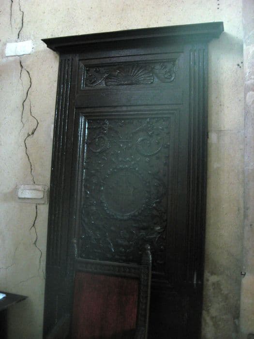 Panneau formant dossier de la chaire. Grand panneau rectangulaire offrant au centre dans une couronne de fleurs et de fruits les armoiries de la métropole de Sens, le tout encadré d'arabesques. Frise meublée d'une coquille soutenue de deux consoles.