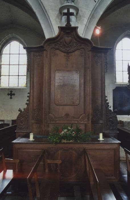 Dossier central surmonté d'une croix, et plus élevé que les 2 panneaux des côtés accostés de consoles à jour et décorés en haut et en bas de motifs sculptés d'époque Louis XV. Le panneau central est décoré de même à son fronton et aux angles inférieurs.