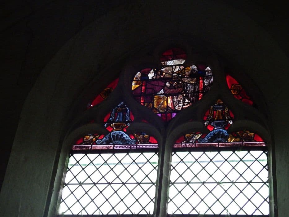 Fragments de vitraux : 1ère fenêtre sud, une magnifique tête d'homme barbue (Christ ou saint Jean-Baptiste) et quelques fragments de phylactères ; 2e fenêtre sud, un évêque en prière au milieu de différents fragments éparses.