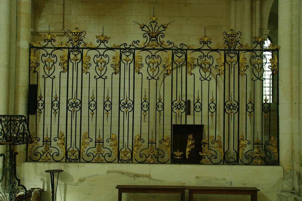 Grilles de pourtour du choeur du 18e siècle. Clôture séparant le transept du bas-côté, du 17e siècle : pilastres ornés de volutes et de frontons richement ornés avec écusson de l'abbaye.