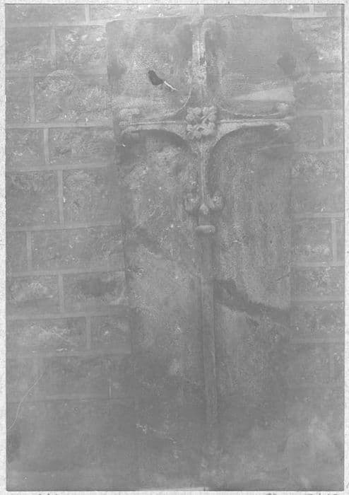 Couvercle de tombe décoré d'une croix en relief. En forme de dos d'âne à quatre versants. Sur la crête, sculptée en relief, est une croix emmanchée d'ne longue hampe, terminée en fleurs de lys, ornée à l'intersection des bras d'une rosace à quatre fleurons.
