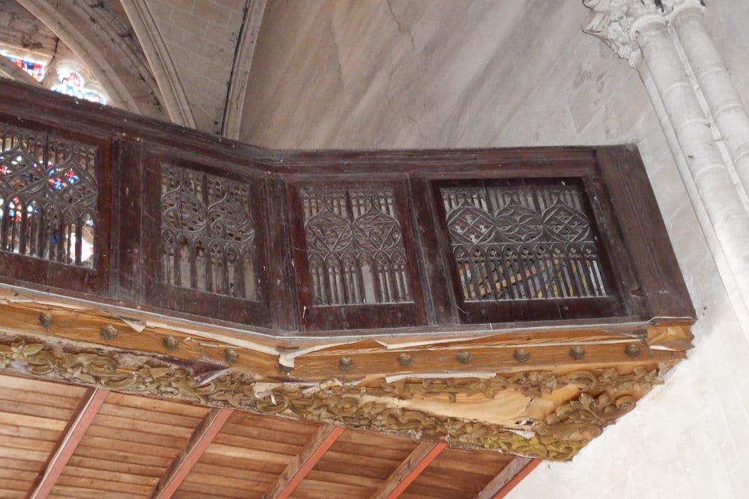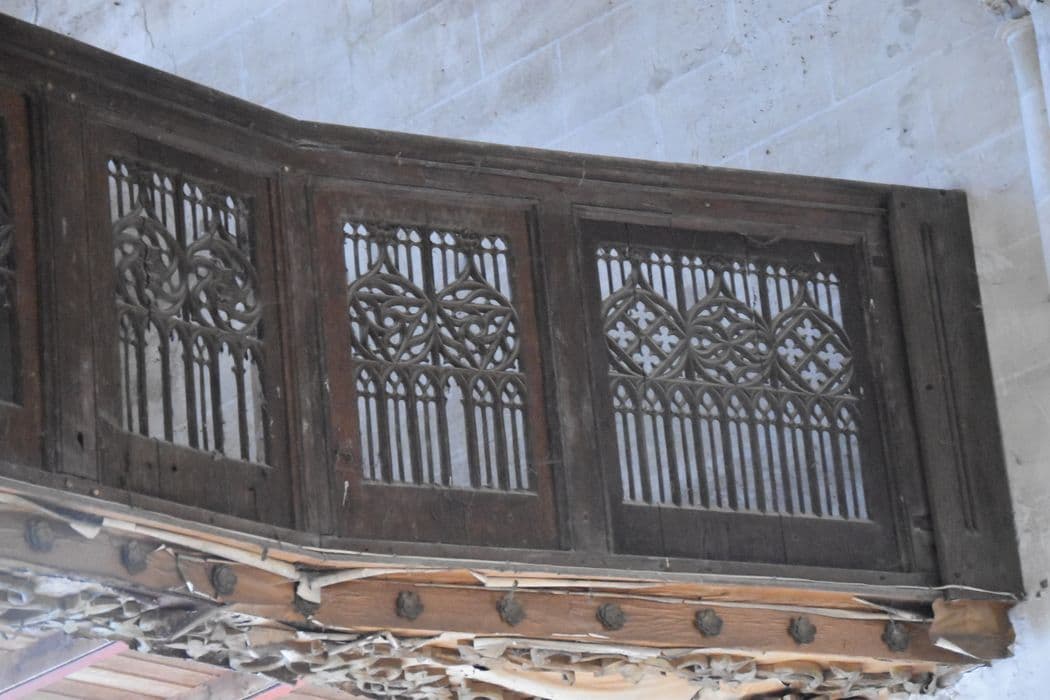 Panneaux formant garde corps de la tribune. Série de panneaux sculptés décorés de fenestrages flamboyants ajourés.