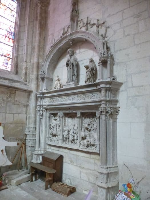 Retable en forme de portique Renaissance couronné d'un arc en plein cintre exhaussé (?) par 2 niches. Sous la frise ornée de rinceaux, 3 scènes de la vie de saint Julien l'hospitalier séparées par 4 colonnettes, sont sculptées en bas-relief et fort mutilées.