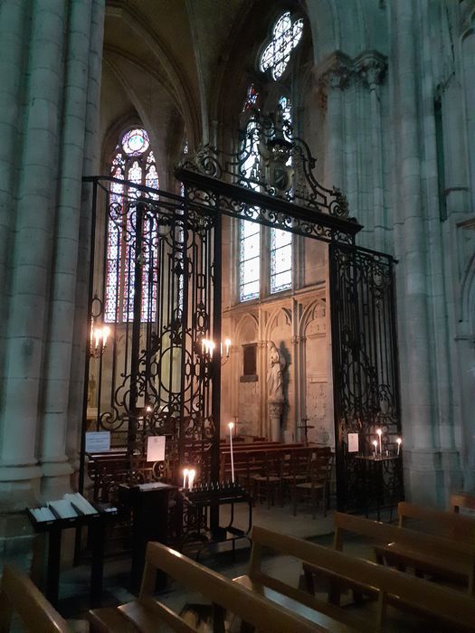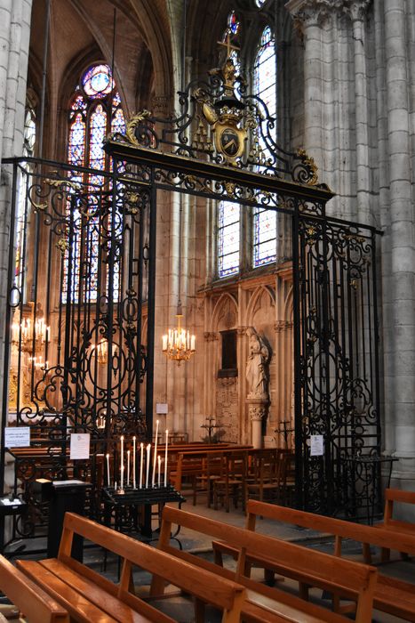 Le marché passé entre les chanoines de Sens et Germain Doré, serrurier à Paris, moyennant 4500 Louis est daté du 19 mai 1764. Au fronton, écusson de Claude Drouas de Boussey, évêque de Toul (1754-1773), ancien chanoine et vicaire général de Sens. Ce prélat, par suite d'un arrangement avec le chapitre donna 4000 (?) à l'église de Sens ; cette somme fut consacrée à payer deux grilles.