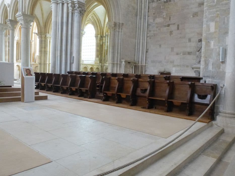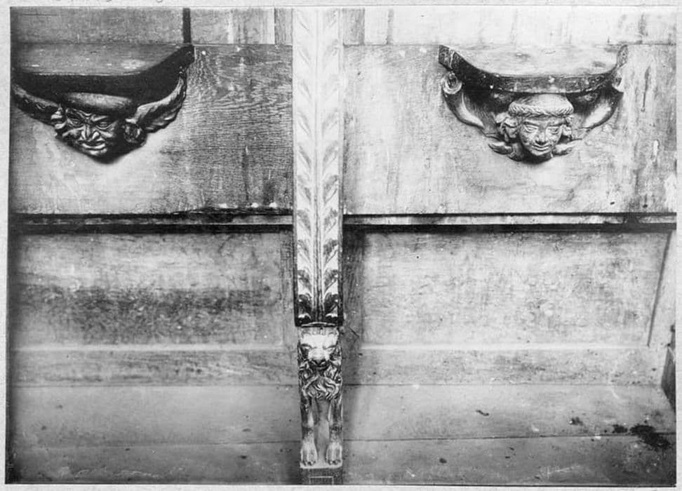 Stalles séparées par des accoudoirs ornés de feuilles de chêne posées symétriquement et supportés par des lions assis ; aux miséricordes, mascarons ailés.