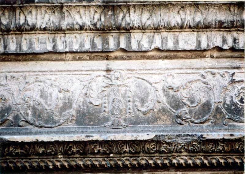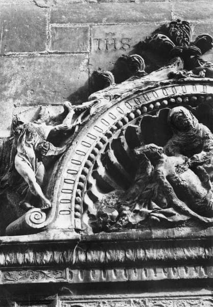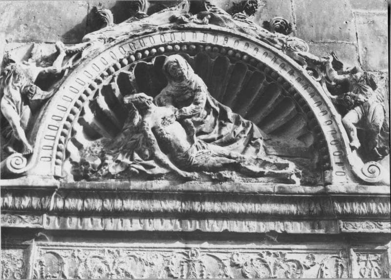 Piétà et son encadrement. Au typan, en forme de coquille, est une Piétà. Le Christ est mort, renversé sur les genoux de sa mère. Au sol, à gauche, un crâne. A droite, sur une sorte de banderole, une inscription gothique. Sur le pourtour de la coquille, encadrant ce bas-relief, deux anges retiennent par la gueule ouverte deux crocodiles dont les queues sont nouées à la clé, formant un chou frisé.