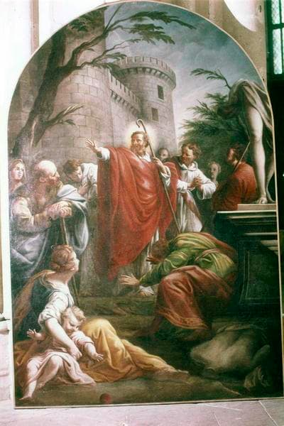 tableau, cadre : Saint Pèlerin évangélisant les Auxerrois et renversant leurs idoles
