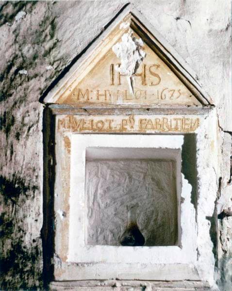 Niche carrée surmontée d'un fronton triangulaire sur lequel est gravée et peinte une inscription. Un bandeau mouluré entoure la niche.