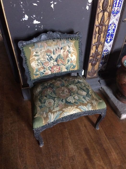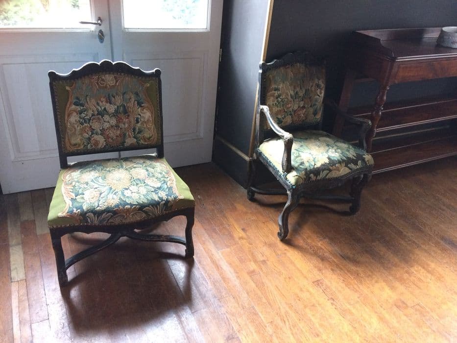 Sièges en bois peint en noir recouverts de tapisseries ornées de pavots.
