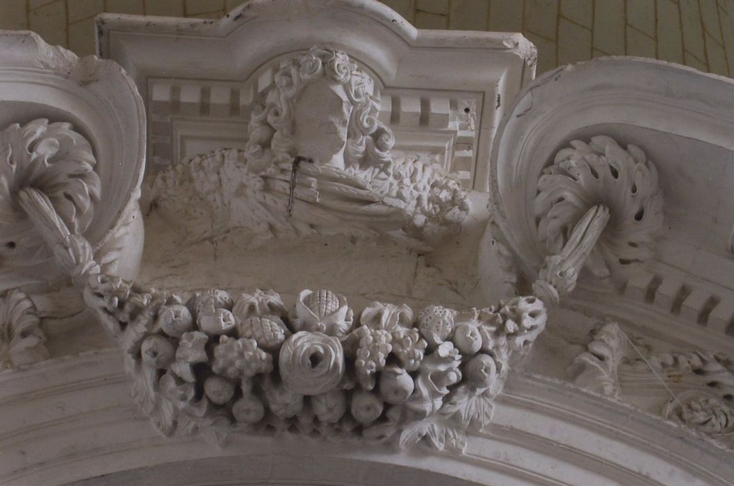Retable de l'autel principal, pierre, et boiseries des portes latérales.