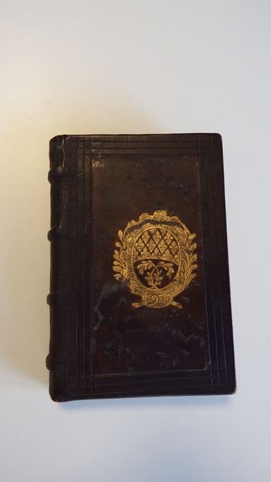 Inv. 33. Imprimé : Heures à l'usage de Rome. Paris, Simon Vostre. Almanach 1513?-1530. In-12 relié, 73 folios (incomplet), car. rom. r. et n., signé Aiiii-Niiii. Gravures sur bois. Rel. v. br. fil. 2 armoiries sur les plats.