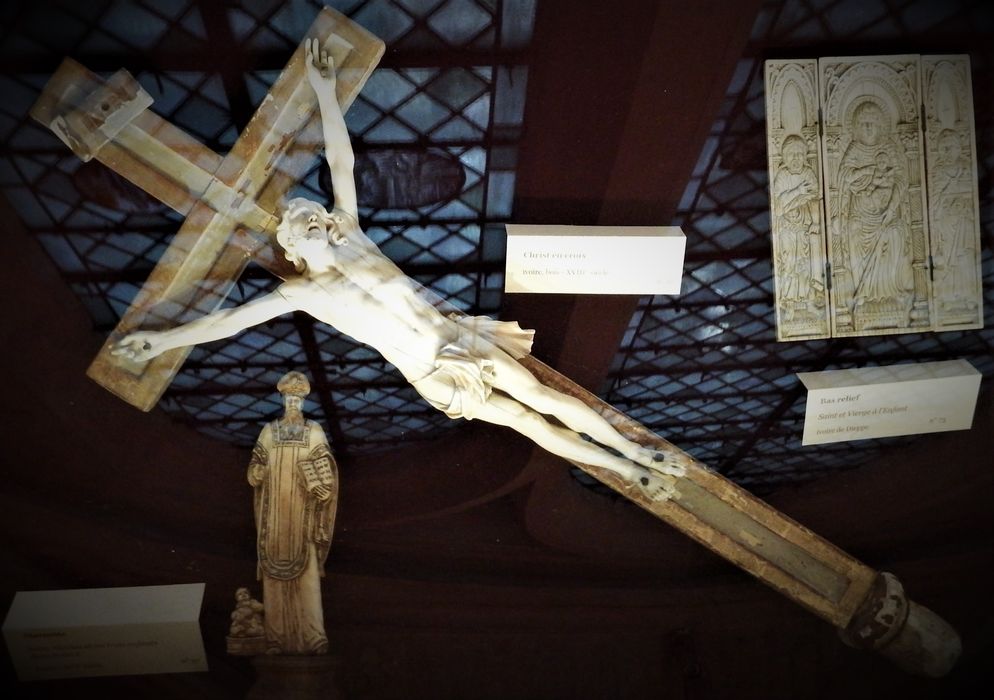 Inv. 65. Ivoire : crucifix. Christ d'ivoire étendu sur une croix de bois peinte en blanc et dorée aux rebords. La croix est dréssée sur un piédestal à 3 gradins de bois peint en blanc avec traces de dorures aux rebords de chacun des gradins.