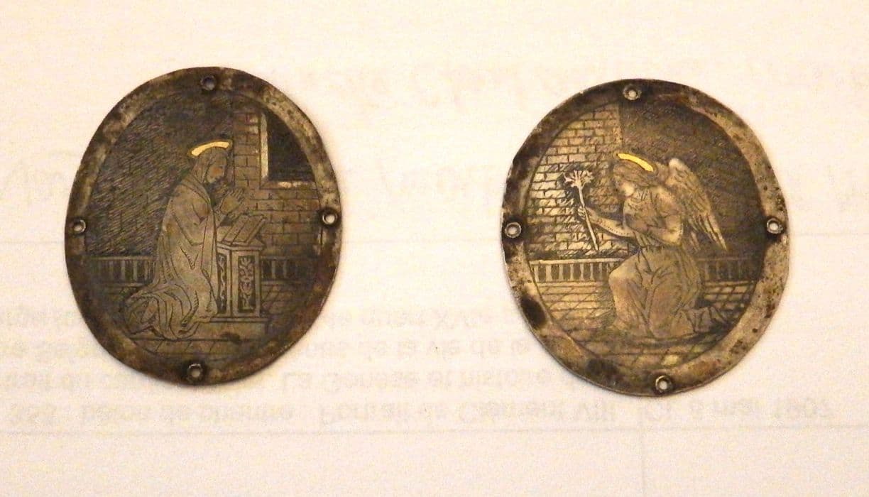 Inv. 108 ter. Argenterie (supplément) : 2 médaillons d'argent représentant en nielles, et à deux, la scène de l'Annonciation.