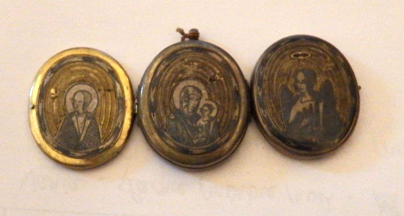 Inv. 109 bis. Argenterie (supplément) : médaillon d'argent, décomposé en 3 volets réunis par des charnières. Sur l'extérieur de chacun des volets sont gravés, sur celui du centre la Vierge et l'Enfant Jésus, sur celui de gauche une sainte nimbée, sur celui de droite un ange aux ailes éployées. A l'intérieur trois personages dont les noms, peints en grisailles, sont en langue russe.