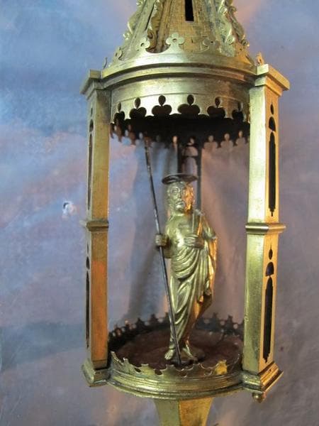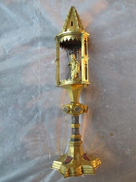Inv. 115. Cuivre, bronze et fer : monstrance. Au-dessous du dais surmonté d'un pignon, se trouve le Christ debout nimbé, et tenant la croix dans la main droite. Le noeud du pied qui a servi pour un calice, est entouré de 6 médaillons à fleurons niellés. Inscription tout autour sur un fond d'émail bleu.