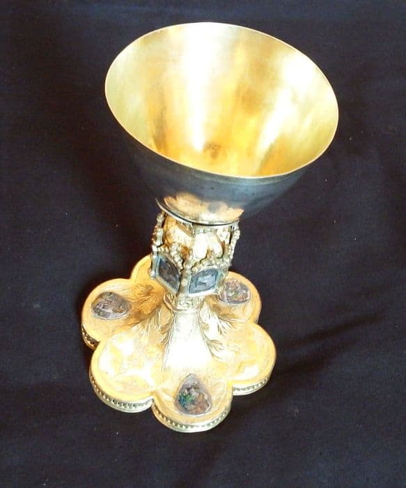 Inv. 120. Cuivre, bronze et fer : calice à coupe d'argent doré, et à pied de cuivre doré. Le noeud est orné de six émaux translucides, représentant l'Ecce Homo, la Vierge à l'Enfant, un saint en adoration devant la croix, etc. Sur le pied sont trois autres médaillons pareils où figurent l'Ecce Homo, la Mater Dolorosa et l'apôtre saint Jean.