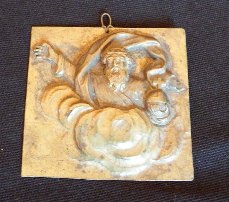 Inv. 137. Cuivre, bronze et fer : plaque carrée en cuivre repoussé, représentant, d'après une fresque de Raphaël aux Loges du Vatican, Dieu le père trônant sur des nuages, tenant dans la main droite la gloire surmonté d'une croix, et bénissant de la main gauche. Au sommet est un anneau de suspension.