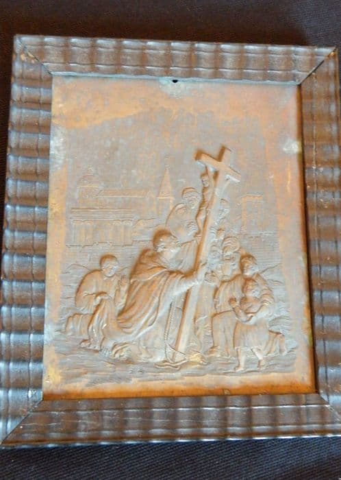 Inv. 142. Cuivre, bronze et fer : plaque en cuivre repoussé, renfermée dans un cadre de bois noir, et représentant, d'après une peinture de maître, Charles Borromée priant Dieu de faire cesser la peste.