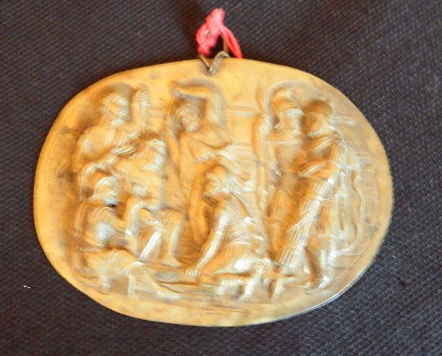 Inv. 154. Cuivre, bronze et fer : médaillon plat et ovale, en cuivre repoussé, muni d'un crochet de suspension, et représentant, d'après une peinture de maître, le Couronnement d'épines.