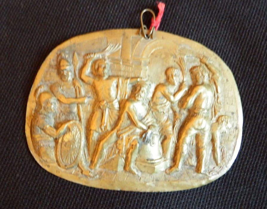 Inv. 155. Cuivre, bronze et fer : médaillon plat et oblong, en cuivre repoussé, muni d'un crochet de suspension, et représentant, d'après une peinture de maître, la Flagellation du Christ.