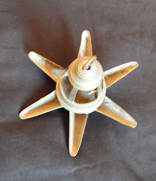 Inv. 172. Cuivre, bronze et fer : lampe à six becs, en cuivre, sans ornementation. Le sommet en forme d'encensoir est à quatre jours, sans grilles.