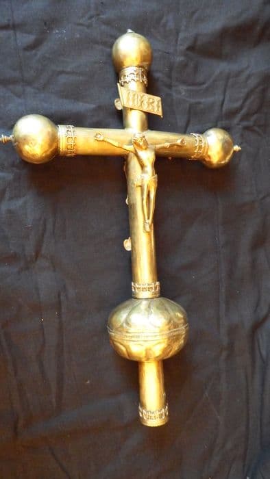 Inv. 197. Cuivre, bronze et fer : croix processionnelle en cuivre aux bras ronds, représentant d'un côté le Christ en croix, et de l'autre la Vierge portant l'enfant Jésus.