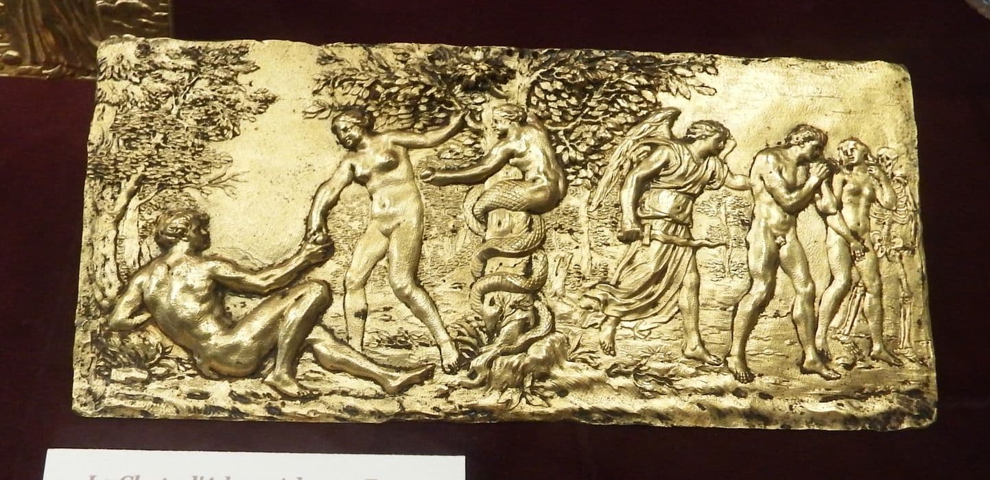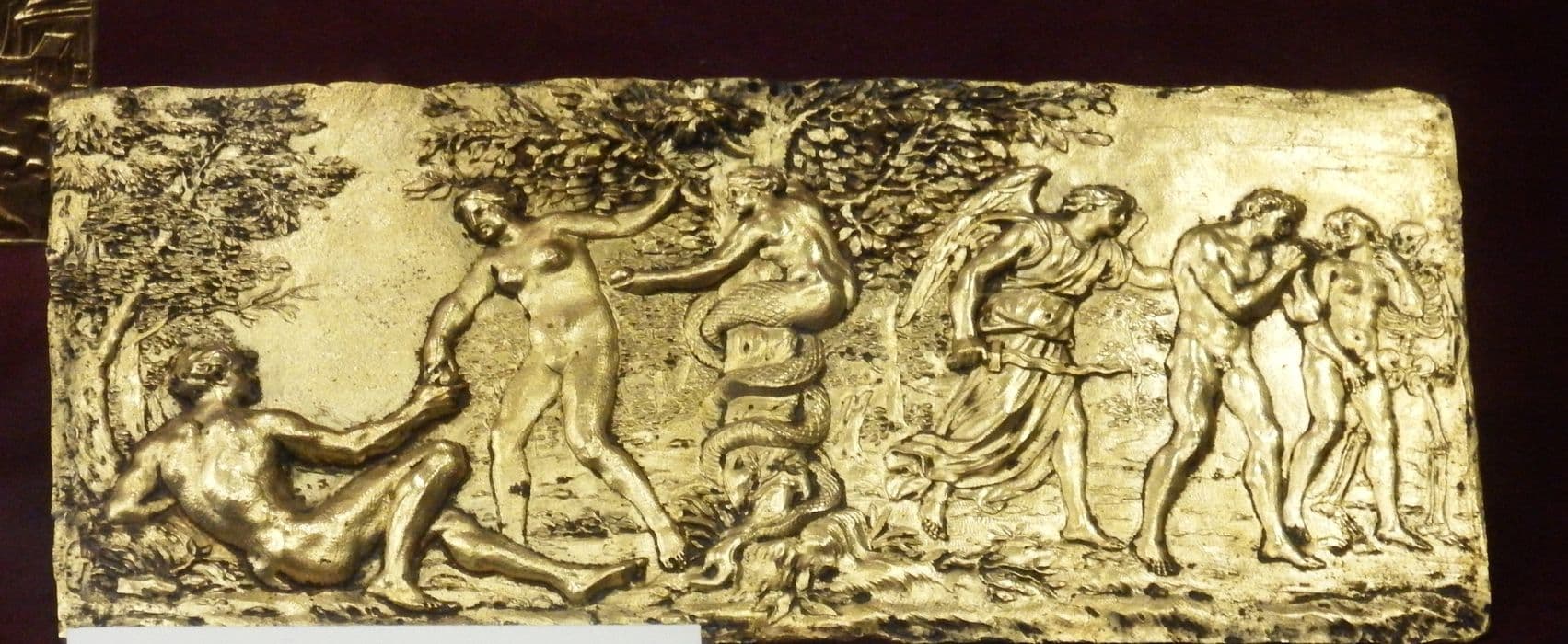 Inv. 140 bis. Cuivre, bronze et fer (supplément) : plaquette de cuivre. Plaquette rectangulaire entourée d'un cadre moderne de bois noir, et représentant sur une plaque de cuivre repoussé et doré, d'un côté la Chûte d'Adam, et de l'autre Adam et Eve chassés du Paradis par un ange, et entrainés par la Mort, d'après une peinture de maître.
