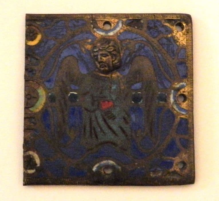 Inv. 199. Emaux : plaque. Cuivre champlevé et émaillé. Le champ d'émail est bleu lapis. Au centre, un ange aux ailes éployées. La tête de l'ange en cuivre doré est rapportée. Les couleurs sont repeintes.