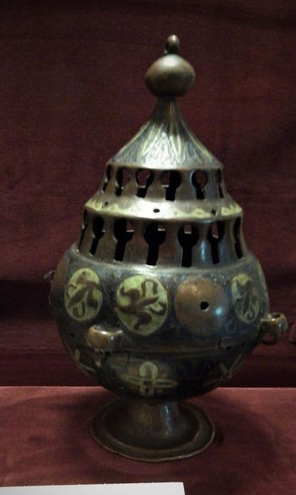 Inv. 203. Emaux : encensoir. Cuivre champlevé, émaillé et doré. Encensoir de forme conique, portant sur les flancs quatre anneaux de suspension, surmonté d'un pommeau de cuivre autrefois doré, et grillé par le sommet en forme de trous de serrure. Cet encensoir est orné à la partie supérieure d'entrelacs d'émail bleu, or et vert. Autour de la panse court un émail à champ bleu, orné de médaillons à champ vert et or, contenant un fleuron d'or. A la partie inférieure, émail à champ bleu, décoré de médaillons à fond d'or et à trèfles verts. Pied en cuivre ornementé à grenetis, autrefois doré ainsi que les grilles. Entre le premier et le second rang des grilles court un listel d'émail vert denticulé. Couleurs repeintes.
