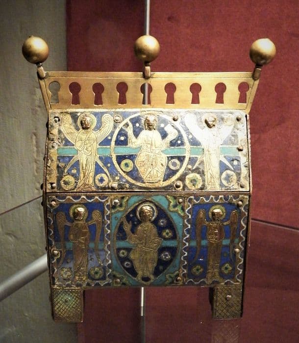 Inv. 210. Emaux : châsse. Cuivre champlevé, émaillé et doré. Châsse en forme de maison sur quatre pieds carrés, surmontée d'une galerie moderne surmontée elle-même de trois boules dorées. Moule de bois. Face antérieure : champ d'émail bleu traversé d'une barre d'émail vert entre deux listels d'or. Au centre, le Christ entre deux anges aux ailes éployées. Figures dorées et rapportées. Face postérieure : moderne et semée de pierres fausses. Pignons : champ d'émail à fond bleu barré de vert. Evangélistes la tête ornée d'un nimbe d'émail vert bordé d'un filet d'or.