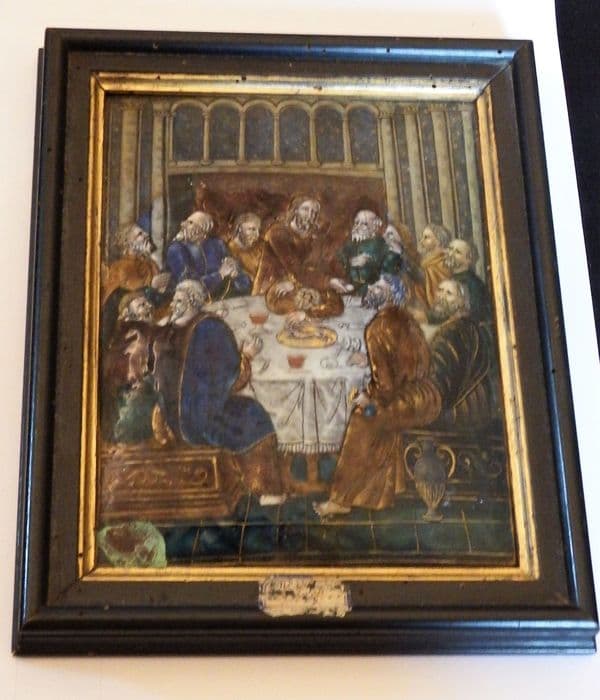 Inv. 224. Emaux : émail. Email peint et polychrome contenu dans un cadre de bois noir, orné d'une baguette dorée, colorié aux tons blanc, violet-pourpre, bleu foncé, bleu clair, vert et jaune d'or, et représentant la Cène. Le Christ, penché sur la table, sur l'apôtre saint Jean, Judas renverse la salière.