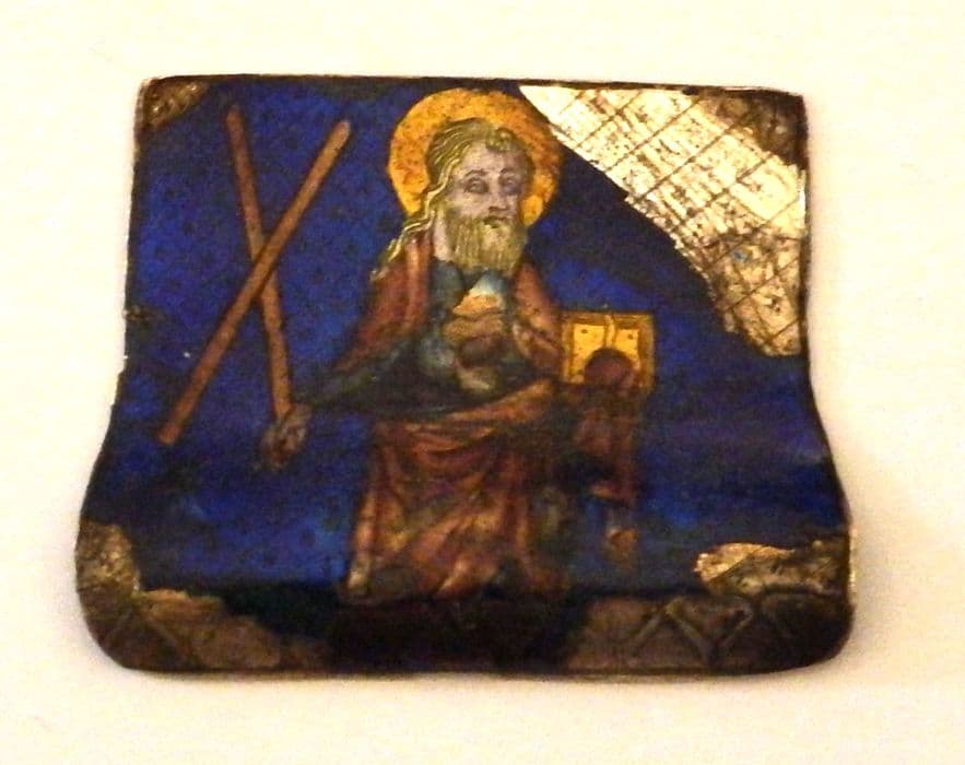 Inv. 239. Emaux : émail. Email translucide sur argent, colorié aux tons vifs d'or, bleu, chair, or, violet-clair et vert, représentant saint André tenant d'une main sa croix et de l'autre un livre, et entouré d'un cadre d'argent richement ornementé.