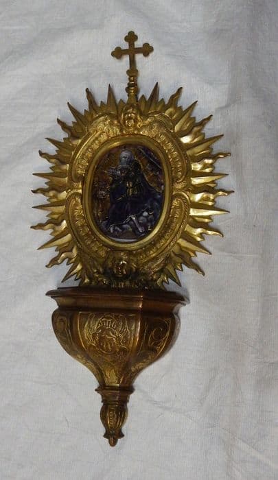 Inv. 241. Emaux : bénitier. Bénitier en cuivre doré surmonté d'une croix, orné de rayons, et décoré de têtes d'anges ailées. Au-dessus de la coquille, émail peint et polychrome, aux tons blanc, or, vert et violet foncé, représentant saint Luc l'évangéliste.
