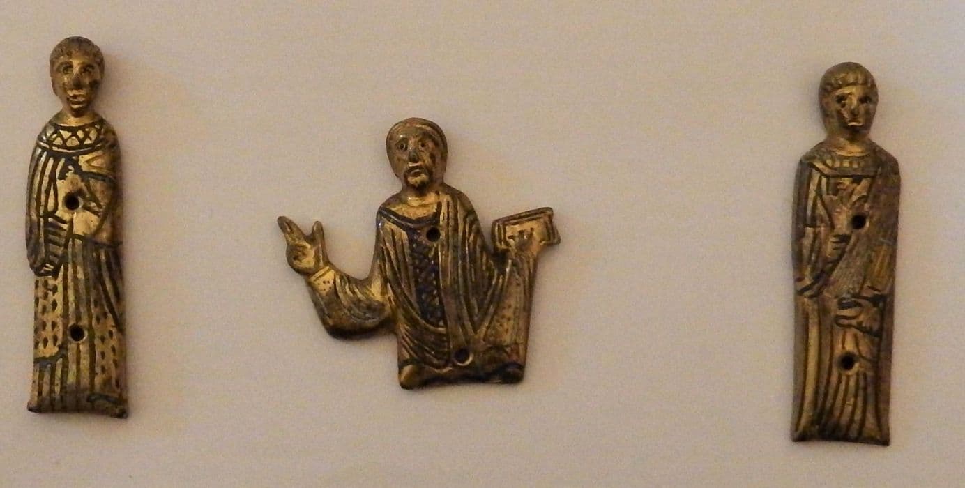 Inv. 245. Emaux : figurines. Trois figurines ayant fait partie d'une châsse de cuivre, dorées et émaillées de bleu et de vert. Les deux premières représentent des moines, la troisième le Christ bénissant.