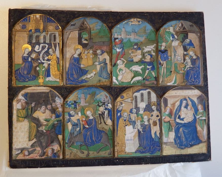 8 enluminures : L'Annonciation, La Nativité, L'Annonce aux bergers, L'Adoration des Mages, Le Massacre des Innocents, La Fuite en Egypte, La Présentation au Temple, L'Apothéose de la Vierge