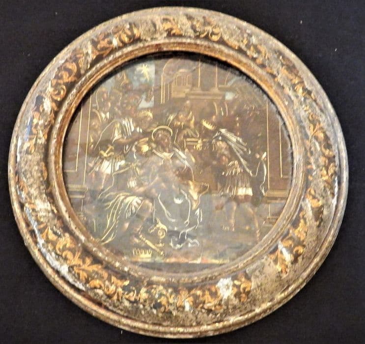 Inv. 263. Peintures, sur toiles, sur verre, sur bois et sur cuivre : peinture. Peinture sur verre, ou plutôt verre églomisé, renfermé dans un cadre de bois noir à fleurons d'or, et représentant sur un fond brun à reflets vert, bleu, or et argent, l'Adoration des Mages.