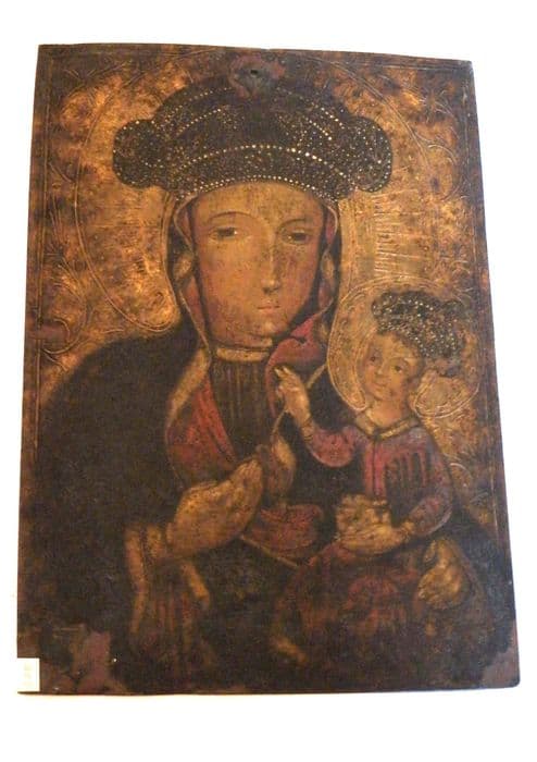 Inv. 278. Peintures, sur toiles, sur verre, sur bois et sur cuivre : peinture. Peinture sur cuivre représentant, sur fond d'or, la Vierge et l'enfant Jésus nimbés, et couronnés de diadèmes de perle. Au dos, un Christ aux bras rapprochés ayant la Madeleine agenouillée à ses pieds.